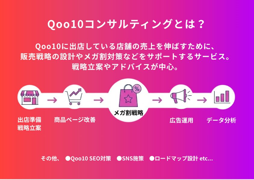 Qoo10のコンサルティングとは、Qoo10に出店している店舗の売上を伸ばすために、販売戦略の設計や商品ページ改善、メガ割対策などをサポートするサービスです。