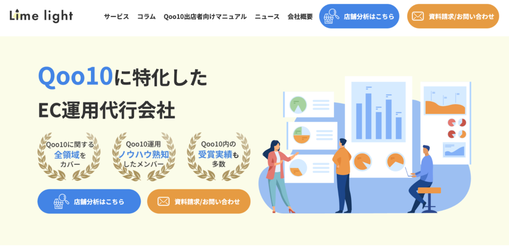 | Limelight株式会社 | eBay社(Qoo10運営)と強固な連携。累計30ブランド以上の支援実績 | 店舗立ち上げプラン:月額5万円〜 運用代行(月額プラン):月額25万円〜 運用代行(成果報酬プラン):15万円〜+売上10% | Qoo10特化 |