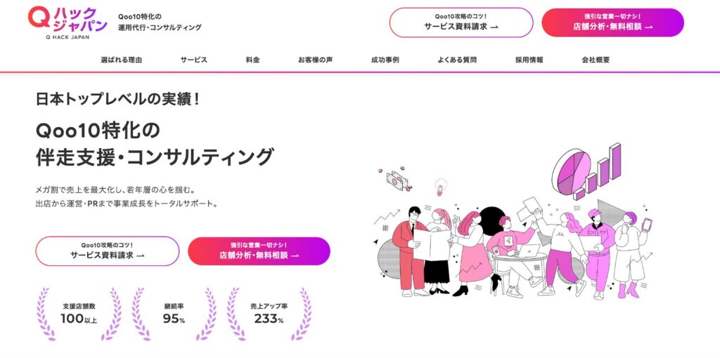 Qハックジャパンは、Qoo10専門特化の支援会社として100店舗以上の支援実績を持ちます。