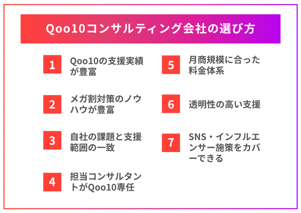 Qoo10コンサルティングを選ぶ際は、料金や実績だけでなく、自社の課題や運用体制に合った会社かどうかを確認することが重要です。